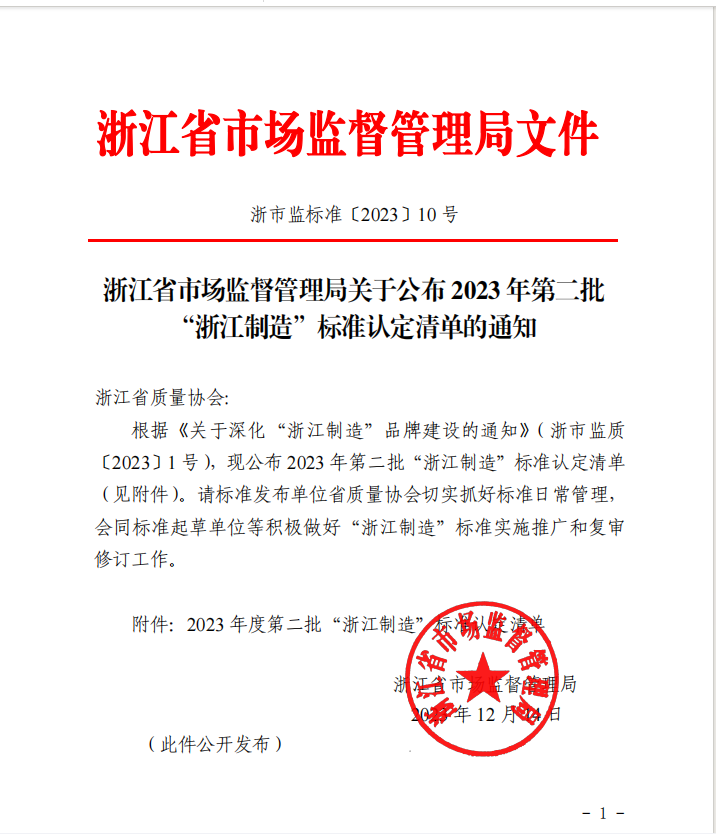 日前,浙江省市場(chǎng)監(jiān)督管理局公布2023年第二批“浙江制造”標(biāo)準(zhǔn)認(rèn)定清單,